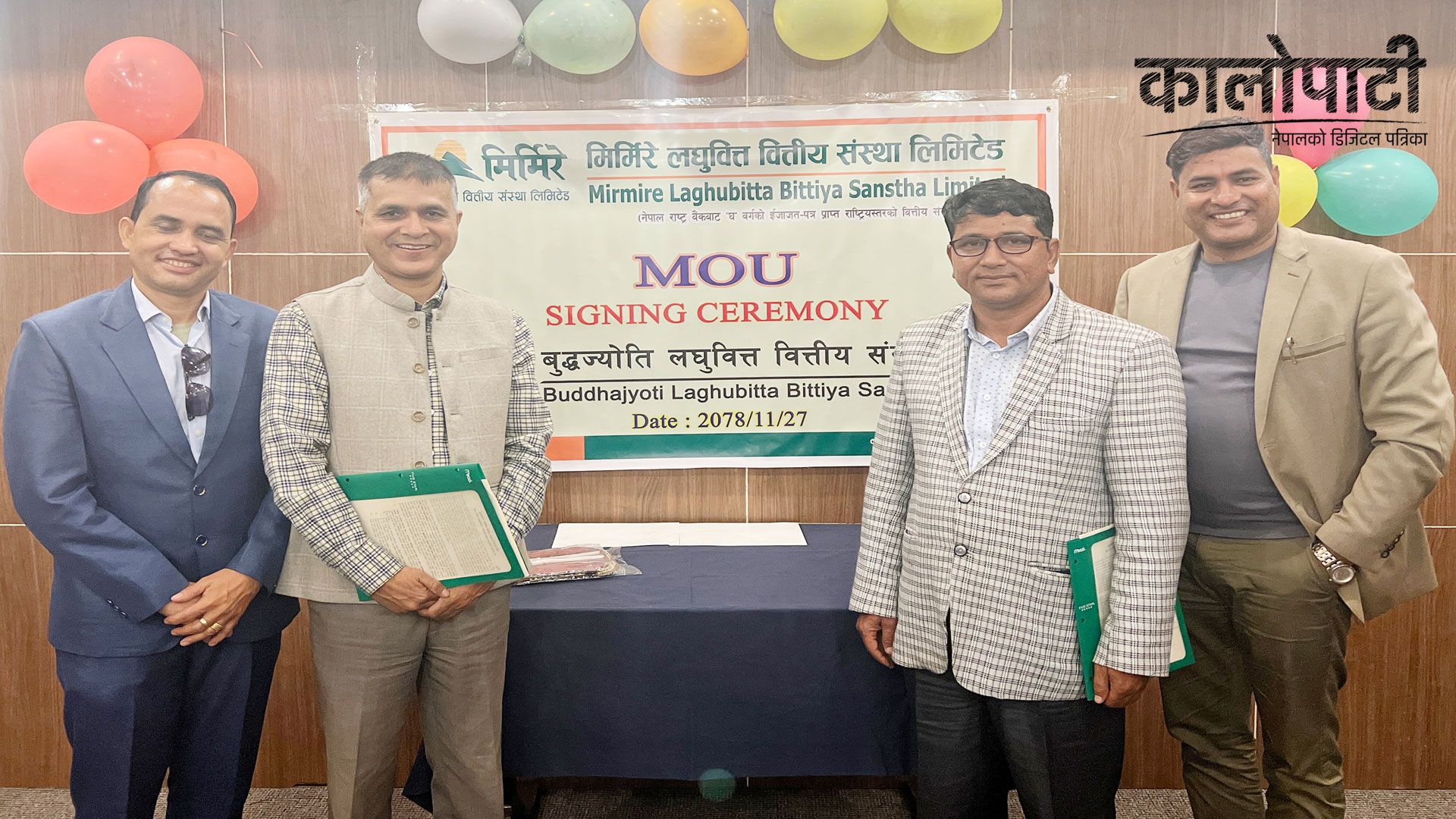 शुक्रबार काठमाडौंमा भएको एक कार्यक्रममा दुबै संस्था बिचमा प्रारम्भिक समझदारी पत्रमा हस्ताक्षर भएको हो । मिर्मिरे लघुवित्त वित्तीय संस्थाका तर्फबाट अध्यक्ष टेकबहादुर बोहरा र बुद्धज्योती लघुवित्त वित्तीय संस्थाका तर्फबाट अध्यक्ष गोविन्द पाण्डेयले समझदारी पत्रमा हस्ताक्षर गरेका छन् । कार्यक्रममा मिर्मिरे लघुवित्त वित्तीय संस्था लि।का संचालकहरु सन्तोष फयल, सञ्जय श्रेष्ठ, प्रविण भट्टराई र प्रमुख कार्यकारी अधिकृत पुष्करराज जोशी एवं बुद्धज्योती लघुवित्त वित्तीय संस्थाका संचालकहरु देब बहादुर कुँवर, कुमारी शान्ता आचार्य र प्रमुख कार्यकारी अधिकृत भक्त बहादुर खड्काको उपस्थिती रहेको थियो ।