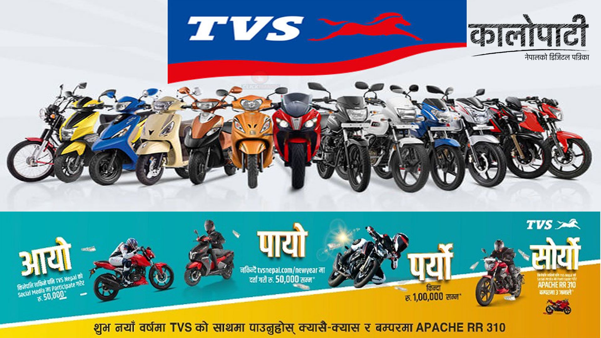 बाइक तथा स्कुटर किन्नु अगाडि tvsnepal.com/newyear मा दर्ता गरेर ५० हजार सम्म जित्न पाउने अनि नेपाल भरी टीभीएसको कुनै पनि बिक्रेताबाट स्कुटर तथा मोटरसाइकलको खरिदमा ग्राहकले १ लाख सम्मको भारी छुट पाउने जनाइएको छ । साथै बम्परमा किने पनि नकिने पनि टीभीएसको सोसल मिडियामा भाग लिएर ३ जना भाग्यशाली विजेताले अपाची आरआर ३१० जित्ने मौका पाउनेछन् । साथै हरेक खरिदमा ग्राहकले शून्य प्रतिशत अनि एक्सचेन्जमा मासिक रकम ५,९९९ किस्ता तिरेर टीभीएस चढेर जान पाउने व्यवस्था मिलाइएको पनि कम्पनीले जनाएको छ ।