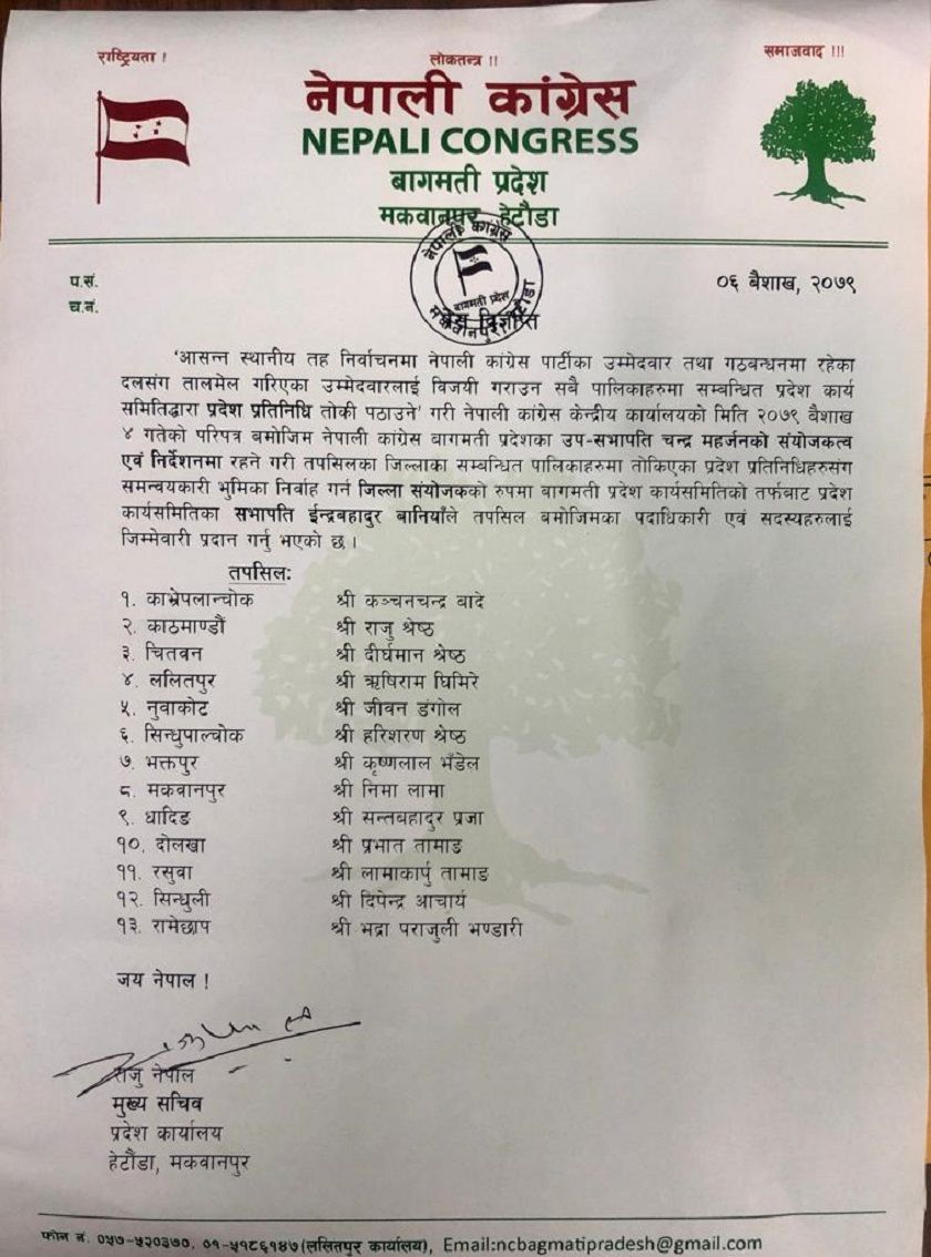 नेपाली काँग्रेस बागमती प्रदेशका उसभापति चन्द्र महर्जनको संयोजकत्व एवं निर्देशनमा रहने गरी १३ जिल्लाका पालिकाहरुमा तोकिएका प्रदेश प्रतिनिधिहरूसँग समन्वयकारी भूमिका निर्वाह गर्न प्रदेशका पदाधिकारी एवं सदस्यहरुलाई जिल्ला संयोजक तोकिएको नेपाली काँग्रेस बागमती प्रदेशले सार्वजनिक गरेको विज्ञप्तिमा उल्लेख गरिएको छ । कार्यसमितिका सभापति इन्द्रबहादुर बानियाँले पार्टी र तालमेल गरिएका दलहरूका उम्मेदवारलाई विजयी गराउन १३ जिल्लामा संयोजकहरूलाई जिम्मेवार प्रदान गरेका छन् ।