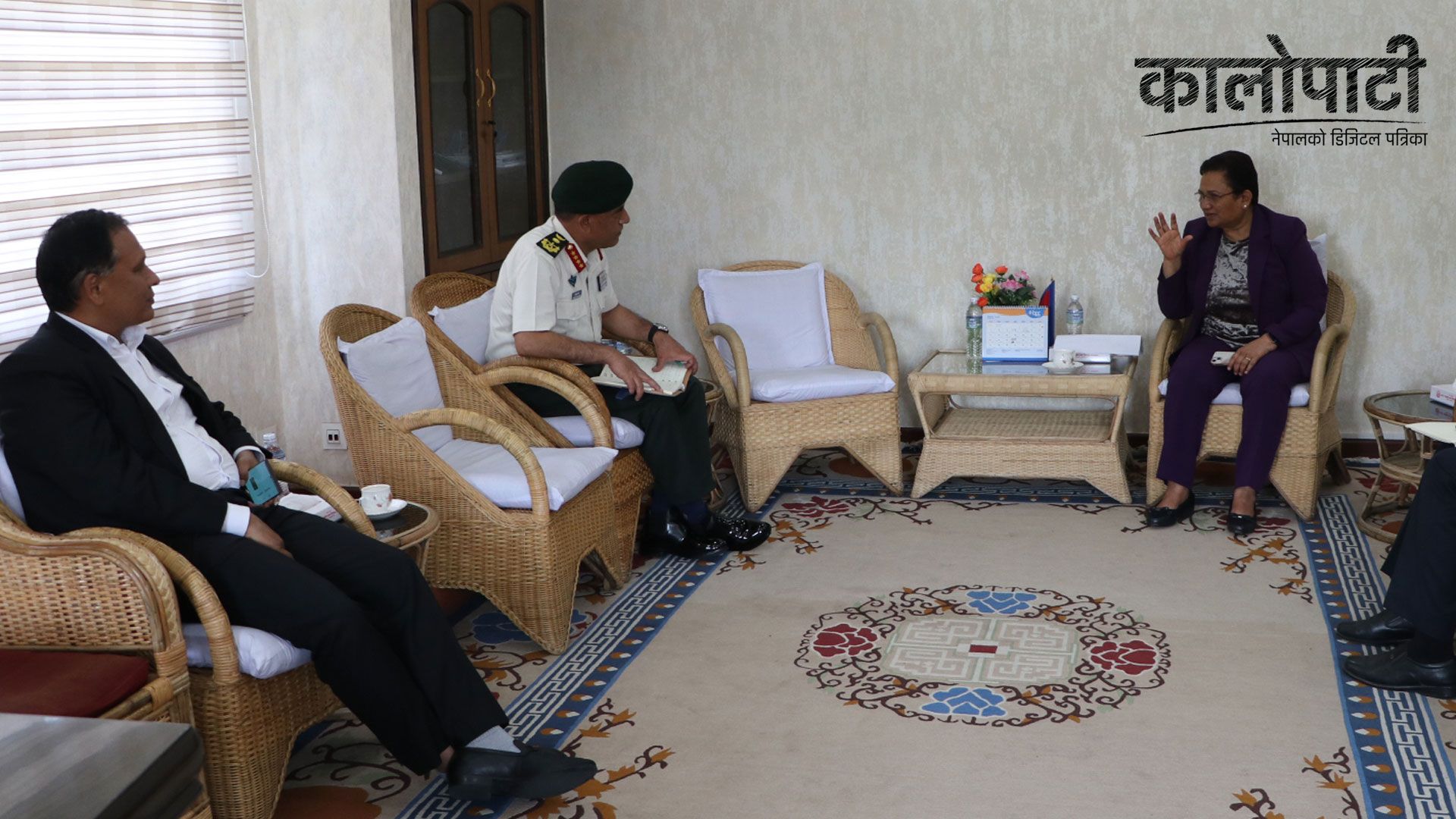काठमाडौं । ऊर्जा, जलस्रोत तथा सिँचाइमन्त्री पम्फा भुसालसँग प्रधानसेनापति महारथी प्रभुराम शर्माले आज भेटवार्ता गरेका छन् । त्यस अवसरमा उनहरुबीच विद्युत्को विकास तथा खपतका विषयमा छलफल भएको थियो । मन्त्री भुसालले विद्युत् खपत बढाउन नेपाली सेनालाई आग्रह गरे । सेनाको भान्सामा प्रयोग भइरहेको अन्य इन्धनलाई बिजुलीले विस्थापित गर्नुपर्नेमा जोड दिँदै उनले भने , “अब नेपाली सेनाका भान्सामा जलविद्युत् नै प्रयोग गरौँ ।
