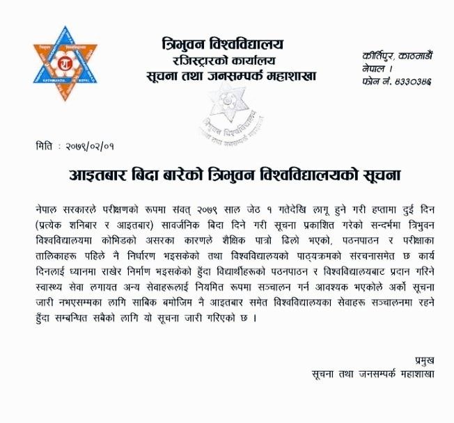 त्रिभुवन विश्वविद्यालयले आइतबार विदा नदिने, हेर्नुहोस सूचना सहित