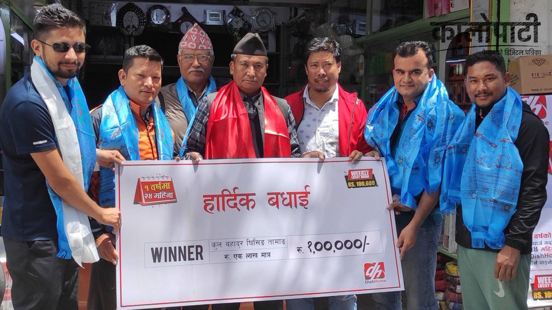 यसै क्रममा दोलखाको तामाकोशी गाउँपालिका २, डाडागाउँका कुल बहादुर घिसिङ तमाङले एक लाख जितेका छन् । श्याम इलेक्टोनिक्स इलेक्टिक डिलर अन्तर्गत रहेको JDOL1-9 का रबिन्द इलेक्टोनिक्सका डिलर दाईकोमा एक वर्ष रिचार्ज गरेर कुल बहादुरले लक्कि ड्रमा सहभागी हुने अवसर पाएका थिए । डिशहोमको तर्फ बाट रिजनल सेल्स म्यानेजर उज्वल न्यौपाने र सेल्स अफिसर मिलन लुईटेलले पुरस्कार रकम हस्तान्तरण गरेका हुन् ।