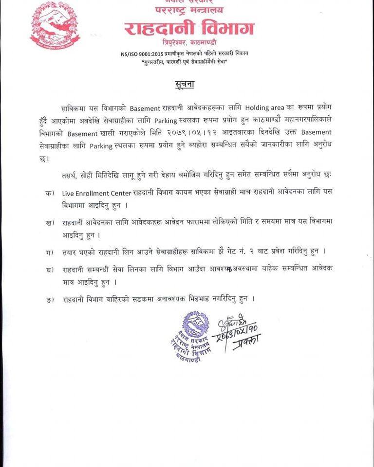 विभागले आइतबारबाट बेसमेन्ट खुल्ला गर्ने भन्दै विभाग बाहिर सडकमा पार्किङ नगर्न र कार्यालयमा सेवाग्राही मात्रै आउन पनि सूचना मार्फत अनुरोध गरेको छ । विभाग बाहिरका सडकमा अनावश्यक भिडभाड नगर्ने समेत विभागले आग्रह गरेको हो ।