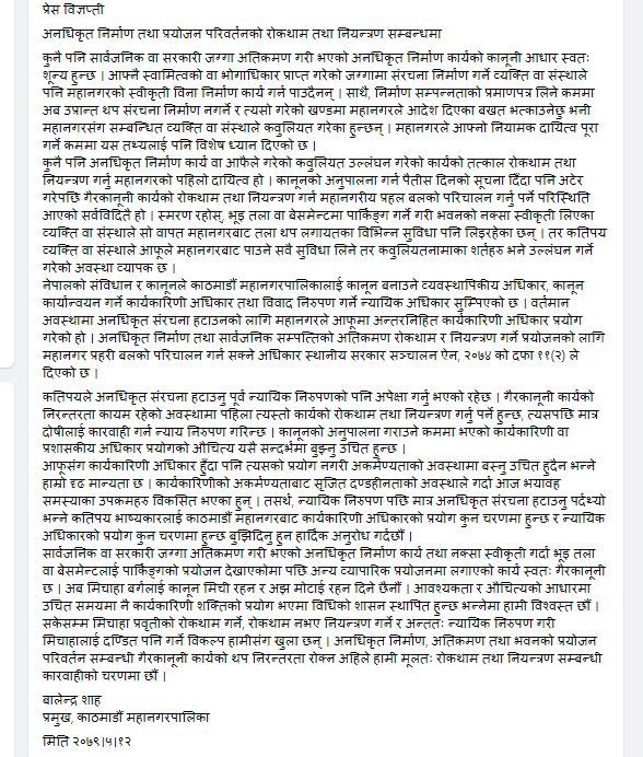 काठमाडौं । काठमाडौं महानगरपालिकाका मेयर बालेन्द्र साहले गैरकानुनी कार्य रोक्न आफूले कार्यकारिणी अधिकार प्रयोग गरेको बताएका छन् । महानगरले मापदण्ड विपरित बनाइएका संरचनाहरु हटाउने क्रममा विभिन्न प्रश्नहरु उठ्न थालेपछि सामाजीक सञ्चाल फेसबुकमा एक विज्ञप्ती सार्वजनीक गर्दै साहले यस्तो स्पष्टीकरण दिएका हुन् । अनाधिकृत संरचनाहरु हटाउन बल प्रयोग गर्नु महानगरको कार्यकारिणी अधिकार भएको उनले दावी गरेका छन् ।