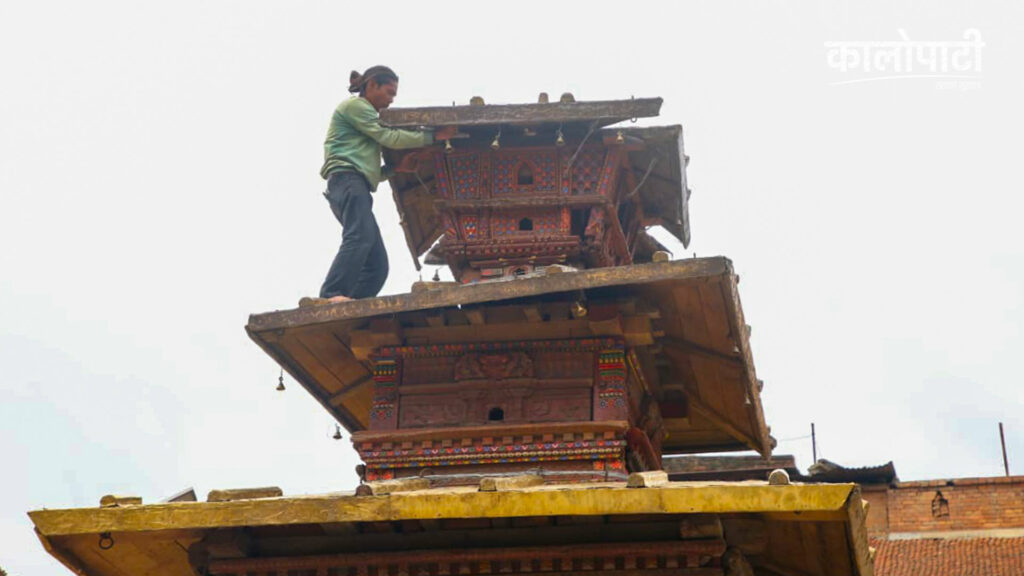Local artisans are currently working to construct the 35-foot-tall wooden pagoda-style three-storey chariot of Shree Bhairavnath as per the tantric method for the Biska Jatra.